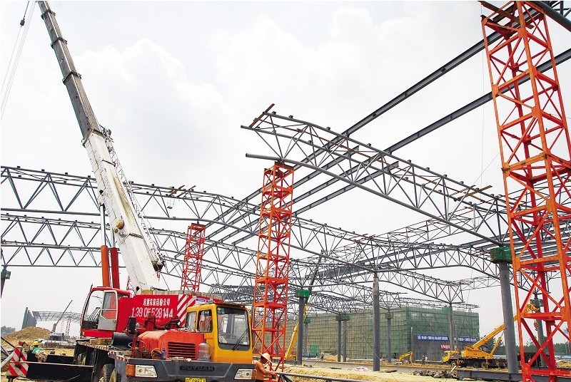 7月2日,施工人員正加緊吊裝京滬高鐵蚌埠站站臺鋼架結(jié)構(gòu)雨棚。作為京滬高鐵全段較大的客站蚌埠站站房工程,目前建設(shè)速度不斷加快,預(yù)計今年9月前站房全部竣工、交付使用。按照列車運行規(guī)劃,2015年??苛熊?0對,2020年??苛熊?3對。記者 郭雷 通訊員竇凱 攝