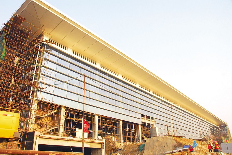 目前,高鐵站站房主體結(jié)構(gòu)已經(jīng)竣工,工人們正在進(jìn)行幕墻玻璃吊裝,玻璃呈淺藍(lán)色,每塊長約2.5米,寬約2米,現(xiàn)已吊裝了約一半的面積。站房內(nèi),工人們正在做室內(nèi)裝修,墻面和承重柱主要采用了灰白相間的花崗巖鋪裝,頂部和地面尚未開始裝潢。據(jù)了解,站房內(nèi)外裝修將在4月底進(jìn)入尾聲,并于5月底基本完成。