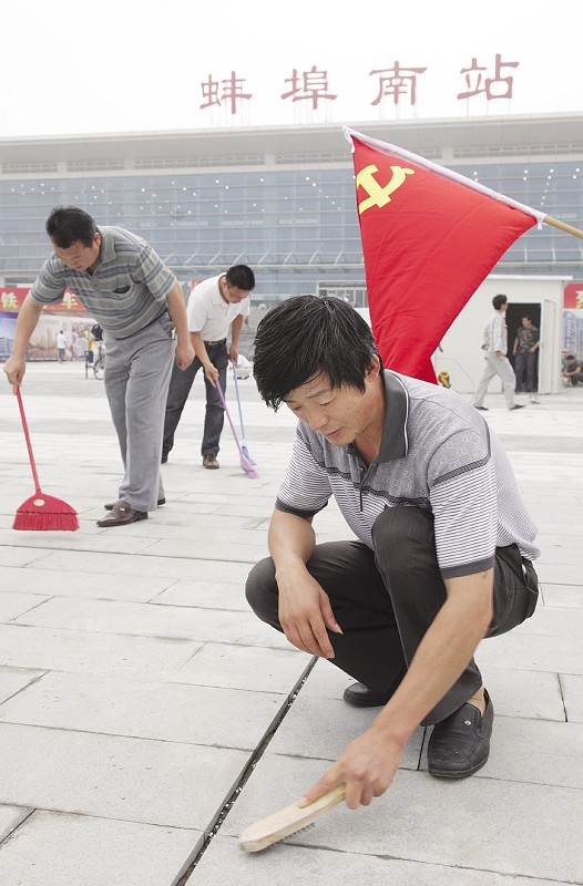 625日上午,為慶祝中國(guó)共產(chǎn)黨建黨90周年暨京滬高鐵開通,蚌投集團(tuán)黨委組織集團(tuán)本部及所屬19個(gè)子公司共計(jì)198名黨員去高鐵蚌埠南站義務(wù)勞動(dòng),清理南站廣場(chǎng)建筑垃圾并清掃地面,為高鐵通車做出一個(gè)黨員力所能及的貢獻(xiàn)。