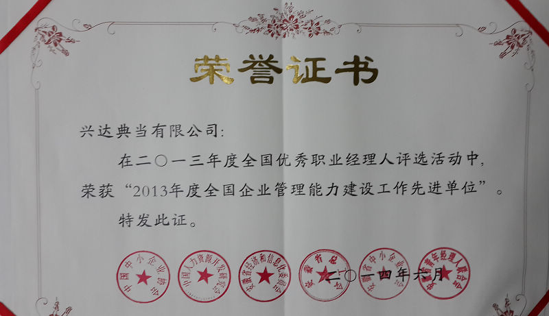 興達典當(dāng)被評為“2013年度全國企業(yè)管理能力建設(shè)工作先進單位”